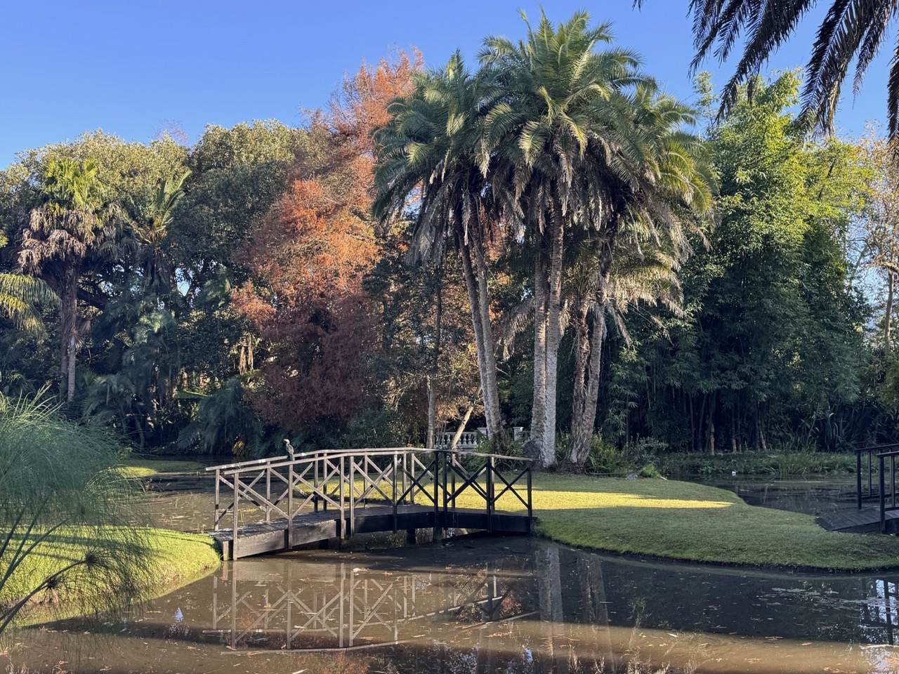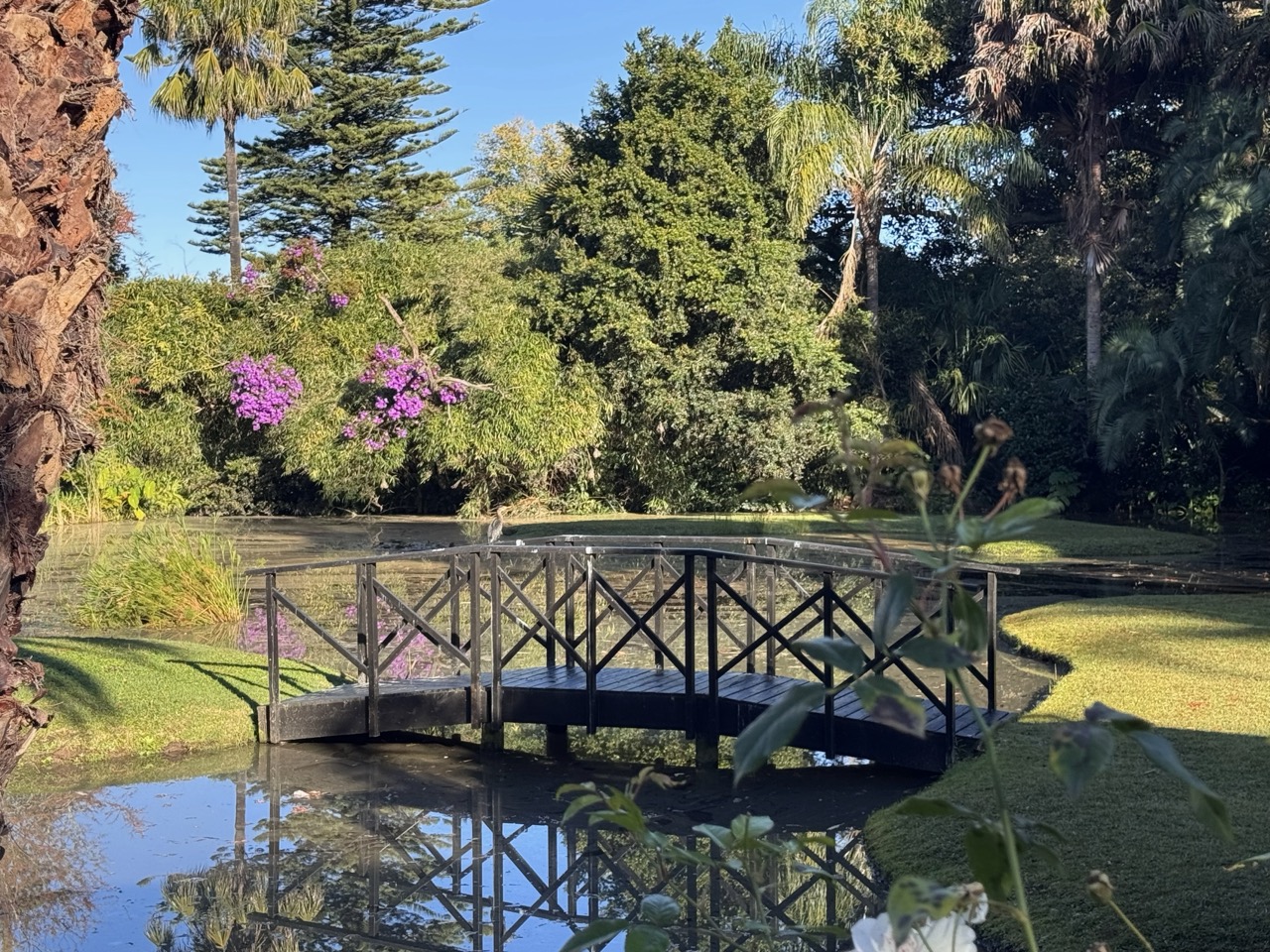 Am Eingang zum The Manor House Fancourt eröffnet ein grosser Teich eine Szenerie wie aus einem Gemälde – üppiges Grün, sanft plätscherndes Wasser und eine Gartenlaube mit weissen Rattanmöbeln, eingerahmt von sanftblauen Hortensien im Hintergrund.