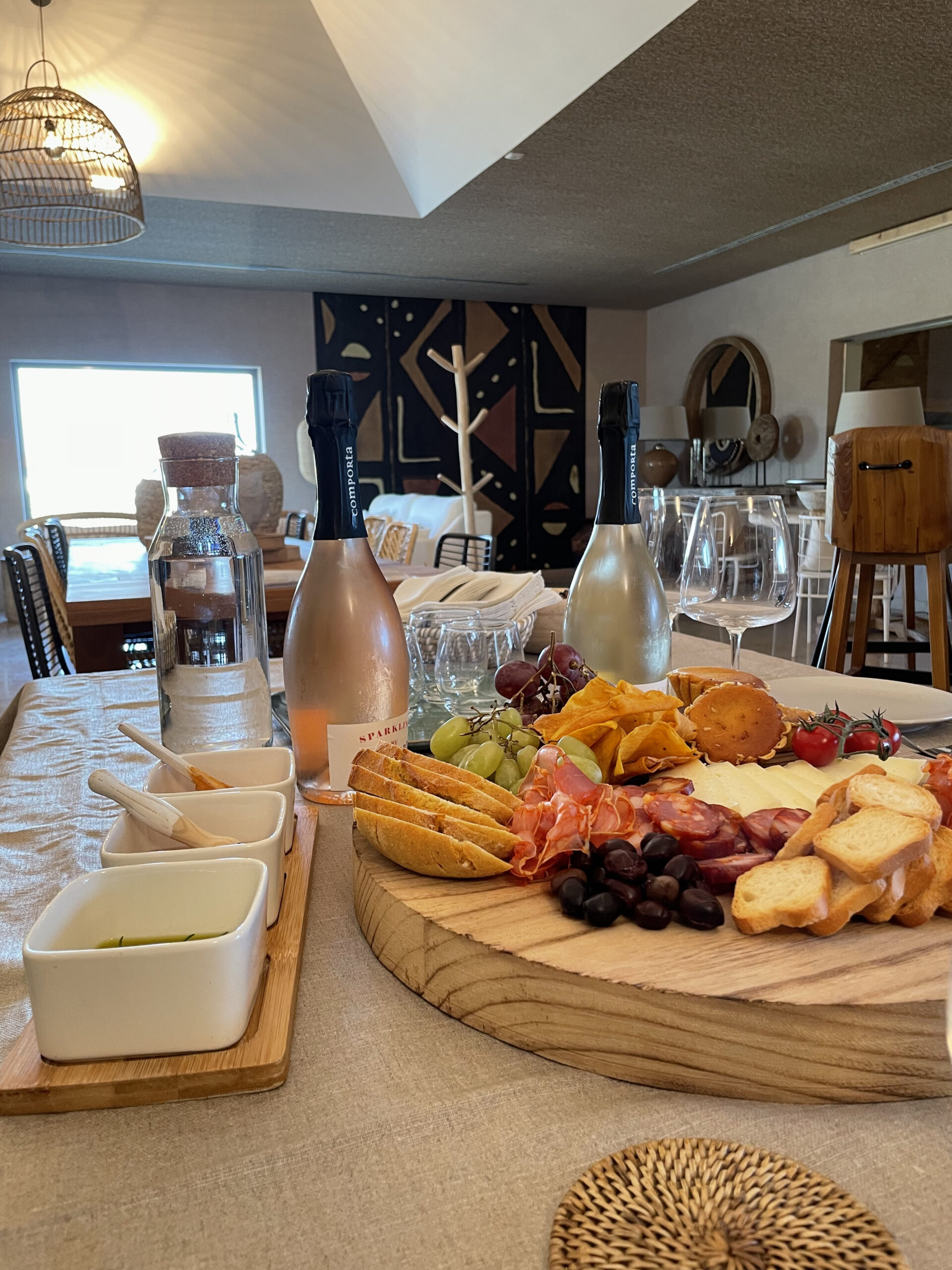 Und dann kommt das Beste: Du wählst deine fünf Weine selbst aus! Von spritzig-frisch bis tiefgründig-komplex – hier kannst du dich durch das gesamte Sortiment probieren und genau die Tropfen entdecken, die deinen Gaumen zum Tanzen bringen. Dazu gibt’s – weil Genuss keine halben Sachen macht – gegen Aufpreis bekommst du eine Auswahl portugiesischer Köstlichkeiten: cremiger Käse, würziger Schinken und hausgemachte Marmeladen – serviert auf einem stilvoll gedeckten Tisch, inmitten des eleganten Ambientes des Weinguts. Die rustikalen Holztische, das warme Licht der Abendsonne und das leise Klingen der Gläser schaffen eine Atmosphäre, in der du dich einfach nur zurücklehnen und geniessen möchtest. Du hast nicht nur Wein probiert. Du hast Portugal geschmeckt.